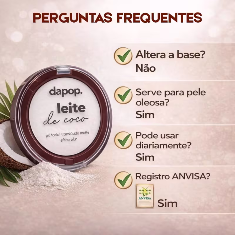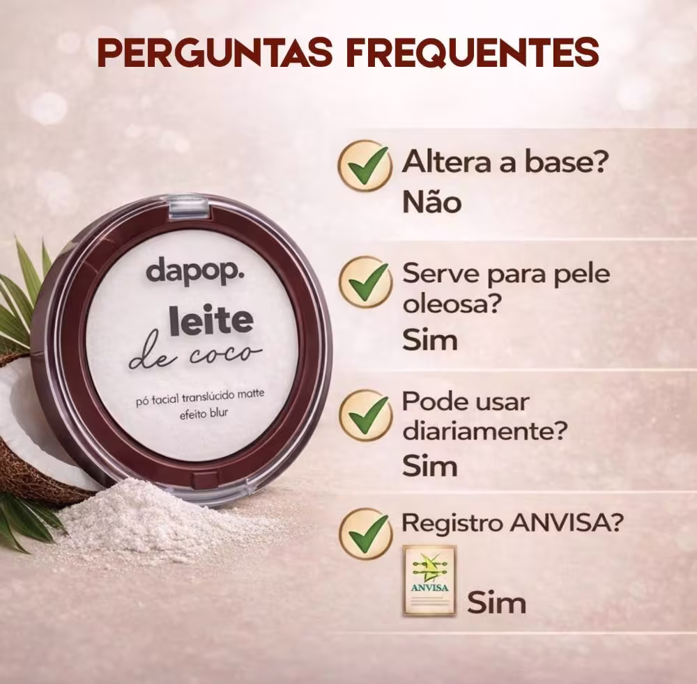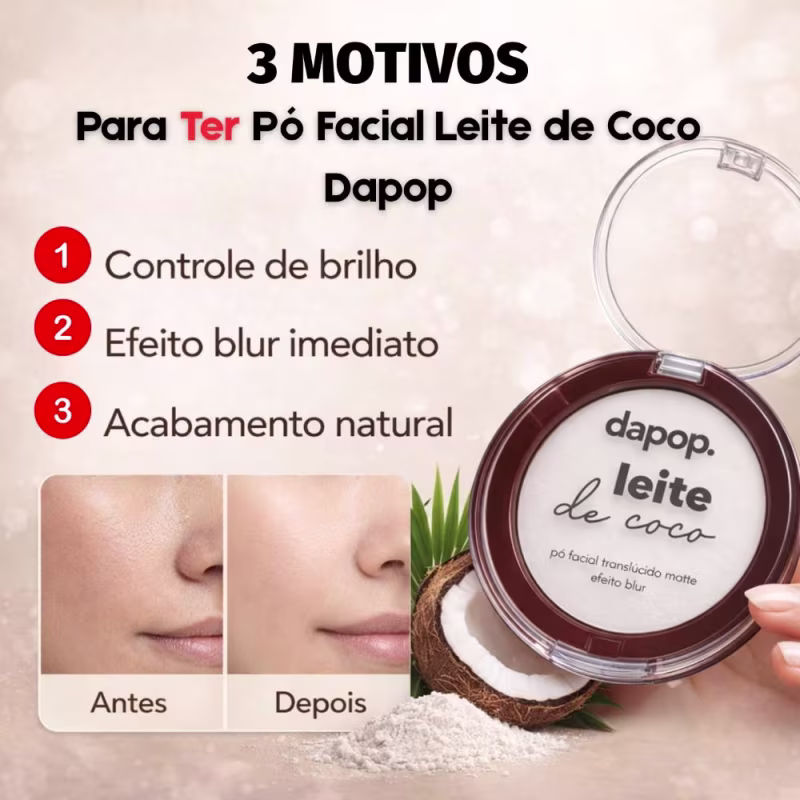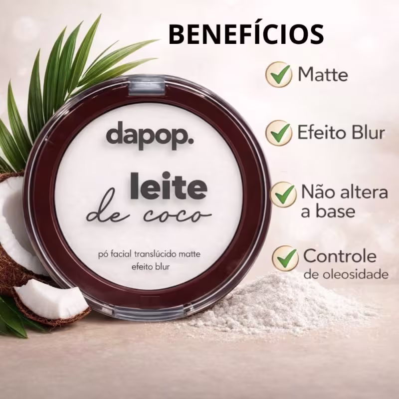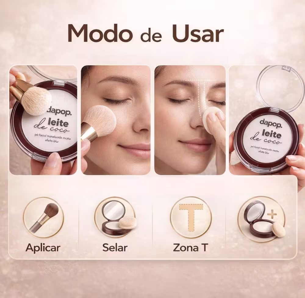 O Pó Facial Translúcido Matte Dapop Leite De Coco Efeito Blur Dp2397 é ideal para uso diário, seja para finalizar a maquiagem, controlar a oleosidade ao longo do dia ou para retoques rápidos. Perfeito para eventos especiais, sessões de fotos ou simplesmente para manter a pele com um aspecto fresco e aveludado em qualquer situação.