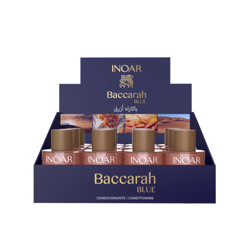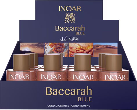 Óleo INOAR Baccarah Blue: nutrição intensa, maciez e brilho luxuoso com Amêndoa Doce e Tâmara.