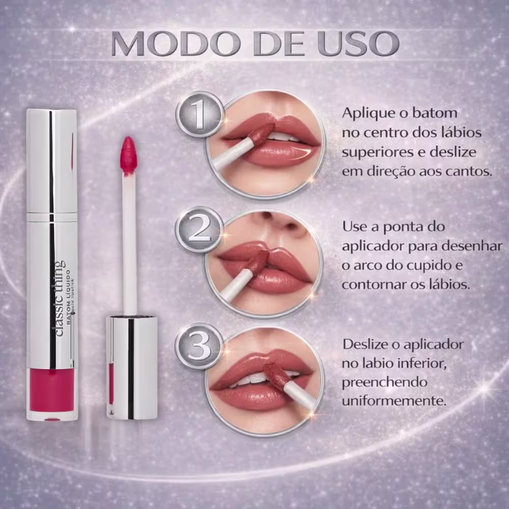 Certifique-se de que seus lábios estejam limpos e secos. Comece aplicando o batom no centro dos lábios superiores, deslizando o aplicador em direção aos cantos. Repita o processo nos lábios inferiores. Para um acabamento mais definido e duradouro, utilize um delineador labial antes da aplicação do batom líquido. Espere alguns segundos para o batom secar completamente e evitar borrões.