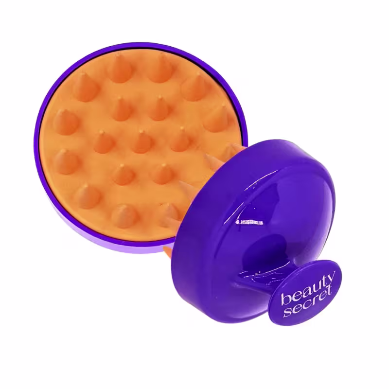 Massageador Capilar Roxo com Laranja: Estimula a circulação sanguínea do couro cabeludo, auxilia no crescimento saudável e potencializa a absorção de produtos durante lavagens ou tratamentos.