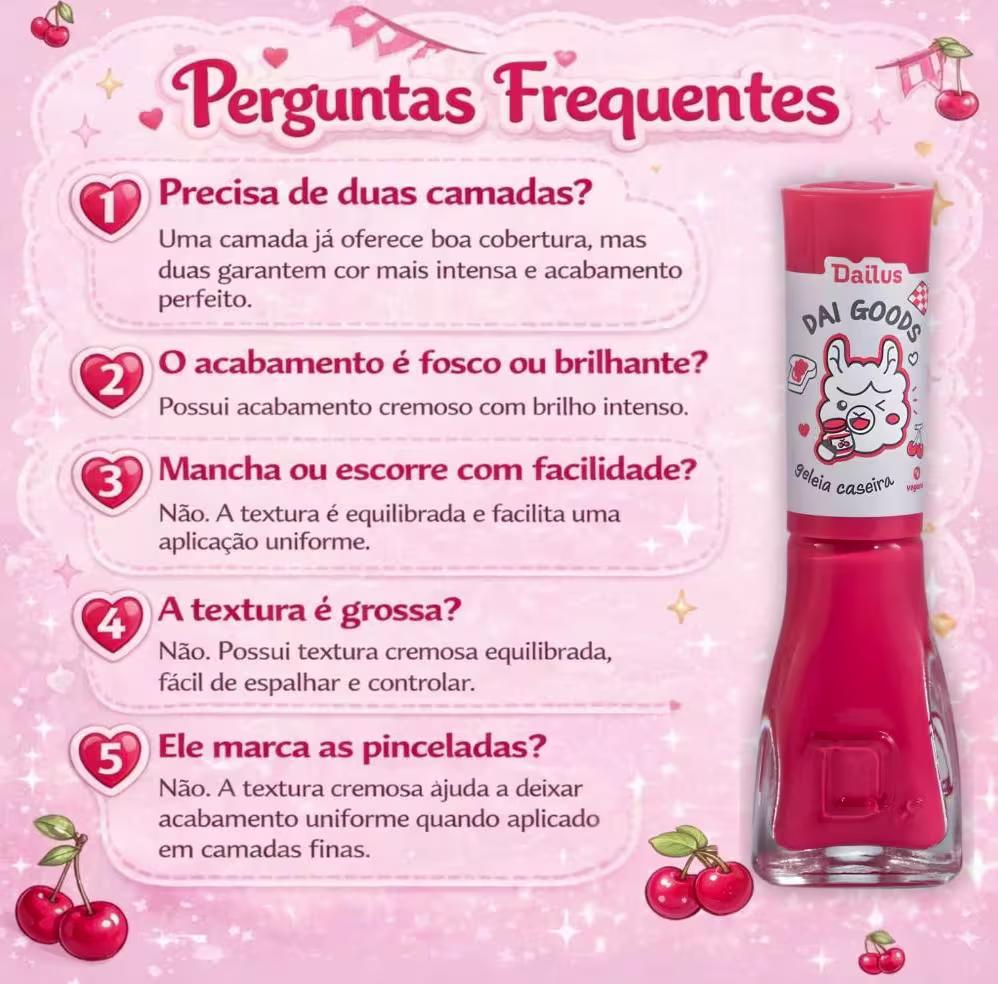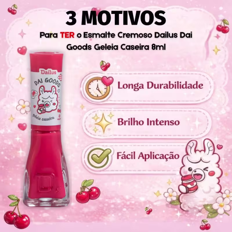 O Esmalte Cremoso Dailus Dai Goods 8ml é a escolha perfeita para quem deseja unhas elegantes e cheias de estilo em qualquer momento. Ideal para o dia a dia, eventos especiais, ou para criar nail arts e combinações únicas que expressam sua personalidade e criatividade.