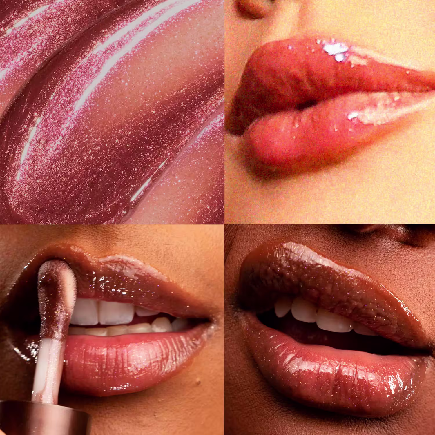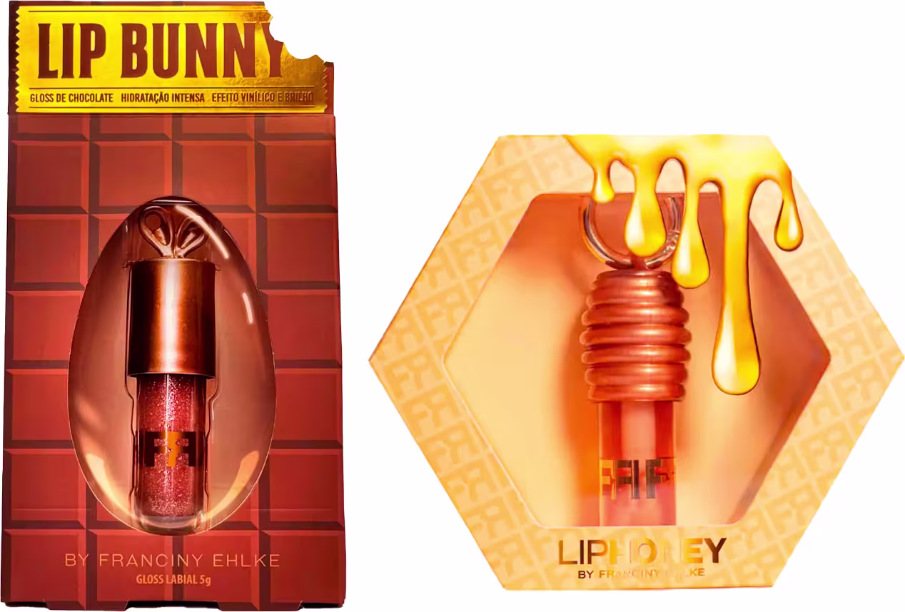 O Gloss LipHoney é incolor, possui aroma e sabor de mel e proporciona hidratação prolongada, deixando os lábios macios, protegidos e com um brilho delicado que realça naturalmente a boca. Já o Gloss Lip Bunny traz um tom marrom frio com nuance de cacau, partículas de brilho e efeito vinílico espelhado, ideal para quem ama lábios marcantes com conforto.