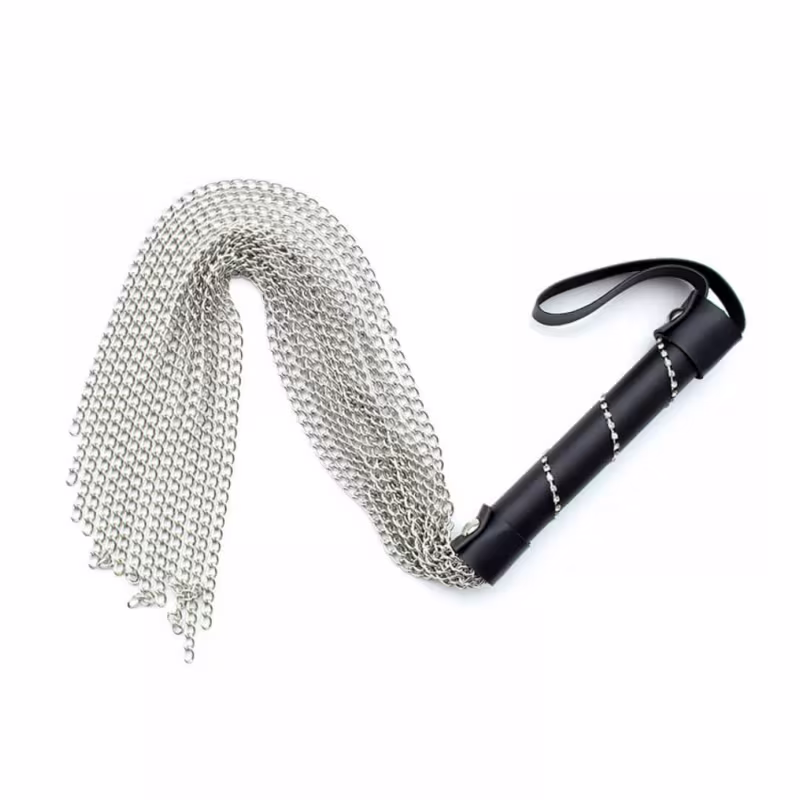 Chicote com correntes e cabo revestido em couro sintético com detalhes em strass. Faça com que o seu parceiro obedeça às suas ordens e vontades, de maneira dócil e afável. Tem uma alça no cabo para facilitar a utilização e arrumação. Este chicote é ideal para casais que querem tornar as suas fantasias ainda mais excitantes!!