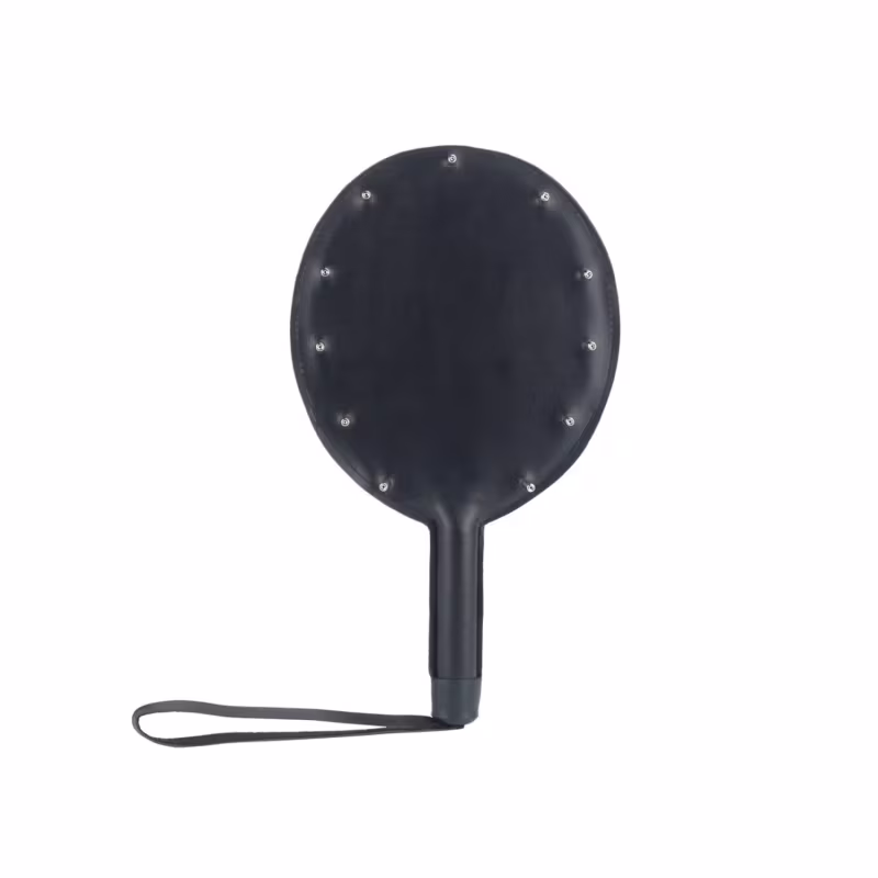 Produzida em courvin resistente, ela traz rebites metálicos que potencializam o impacto — criando uma sensação mais intensa, quente e envolvente, perfeita para quem busca prazer e poder na mesma medida. Os rebites não machucam, mas intensificam o estímulo na pele, concentrando o toque e tornando cada movimento mais provocante. Ideal para quem deseja explorar limites e sensações sem perder o controle do jogo.