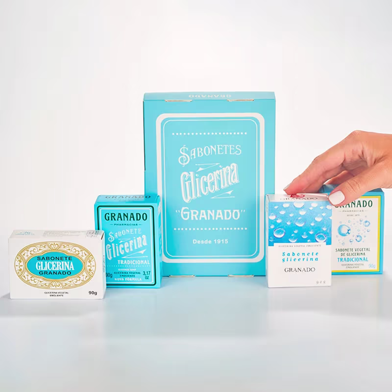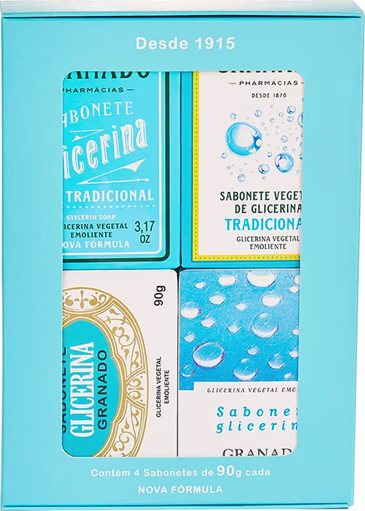 Não sei o CEPO Kit de Sabonetes Histórico Glicerina Tradicional Granado celebra a tradição de um dos produtos mais icônicos da perfumaria brasileira. Inspirado no primeiro sabonete de glicerina lançado pela marca em 1915, o kit reúne quatro unidades da clássica fragrância Tradicional, em embalagens comemorativas que representam diferentes momentos da sua história.