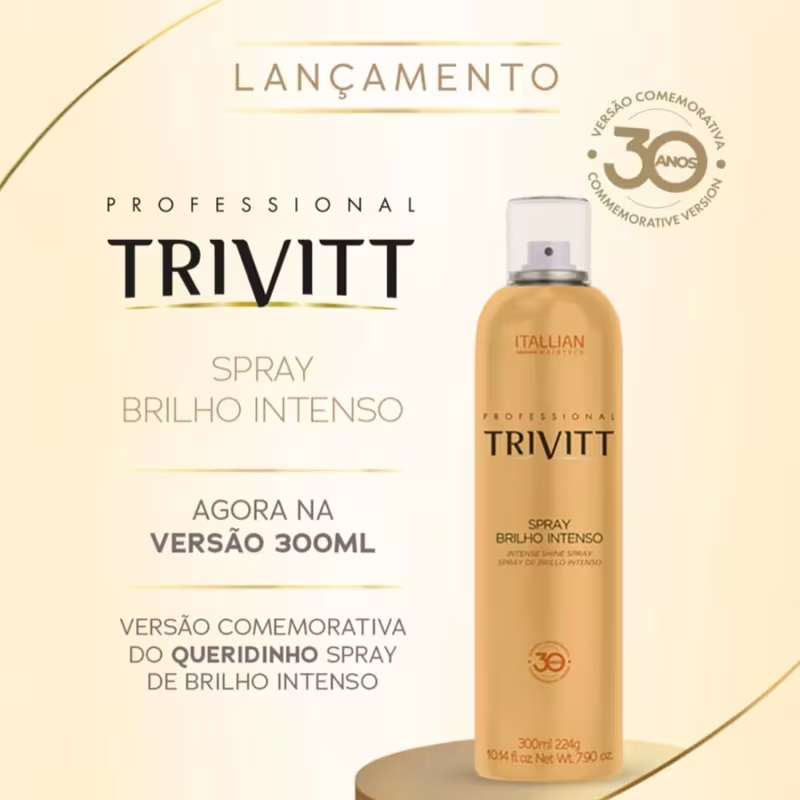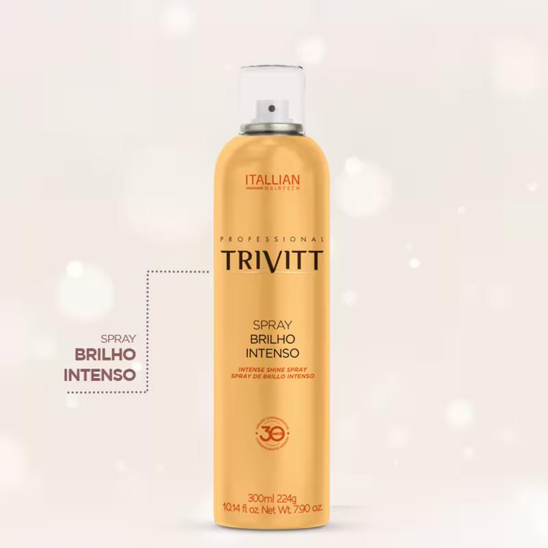 Agora de cara nova, o Spray de Brilho Intenso Trivitt Itallian chega com embalagem amarela moderna e vibrante e com tamanho maior, agora com 300ml, oferecendo ainda mais rendimento e praticidade para o uso diário ou profissional. Desenvolvido para realçar a beleza dos cabelos, proporciona brilho intenso sem pesar os fios, sendo ideal para finalizar penteados. Valoriza o visual com luminosidade imediata, deixando os cabelos macios, sedosos e com toque leve.