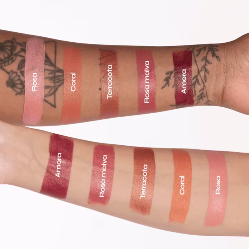 A cor Amora possui acabamento opaco e sofisticado, ideal para realçar diferentes tons de pele com naturalidade. Indicado para todos os tipos de pele, inclusive oleosas, acneicas e sensíveis, podendo ser usado com segurança no dia a dia.
