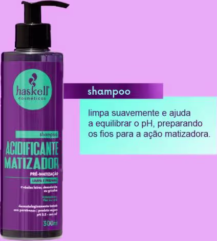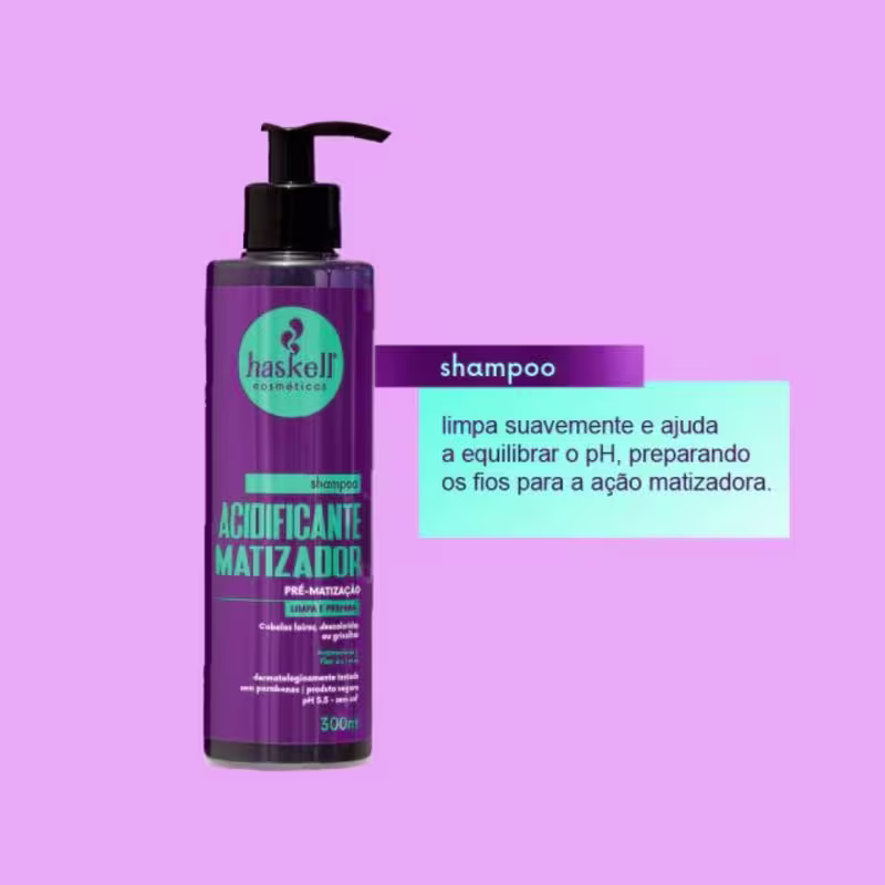 Não sei o CEPO Shampoo Acidificante Matizador Haskell é o primeiro passo para uma matização eficiente e uniforme. Desenvolvido especialmente para cabelos loiros, descoloridos ou grisalhos, ele promove limpeza suave enquanto equilibra o pH dos fios, preparando a fibra capilar para a ação matizadora.