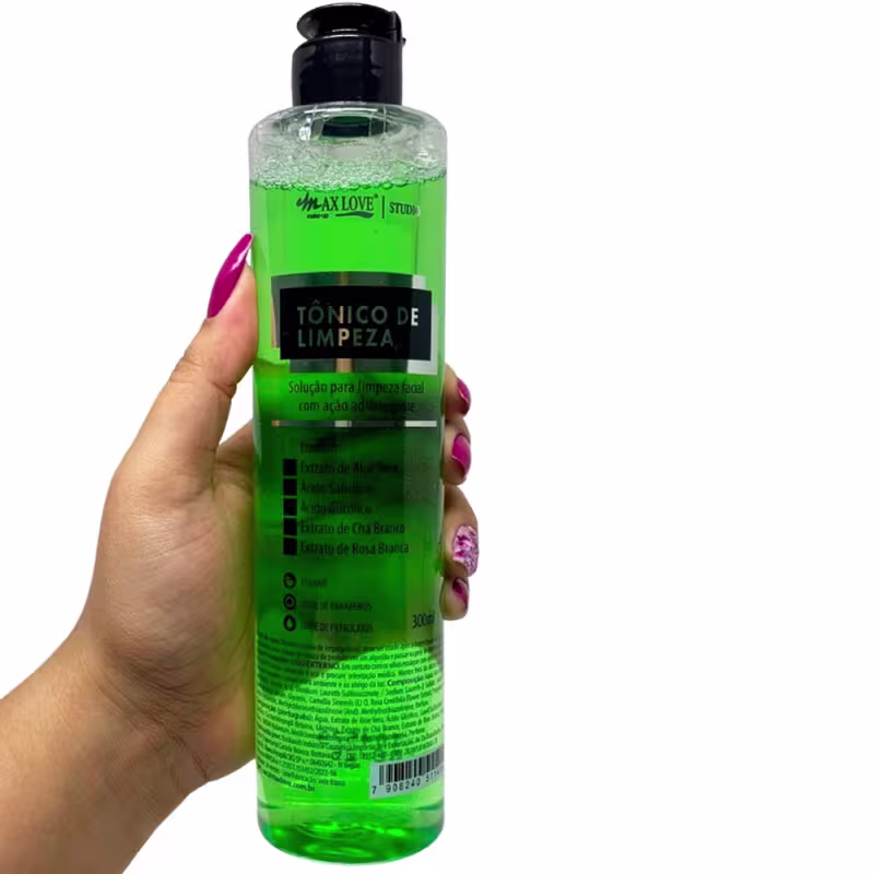 O Tonico de Limpeza Facial da Max Love limpa e remove as impurezas do rosto, ideal para limpar enquanto trata.