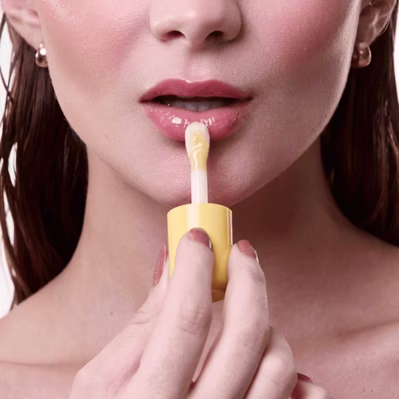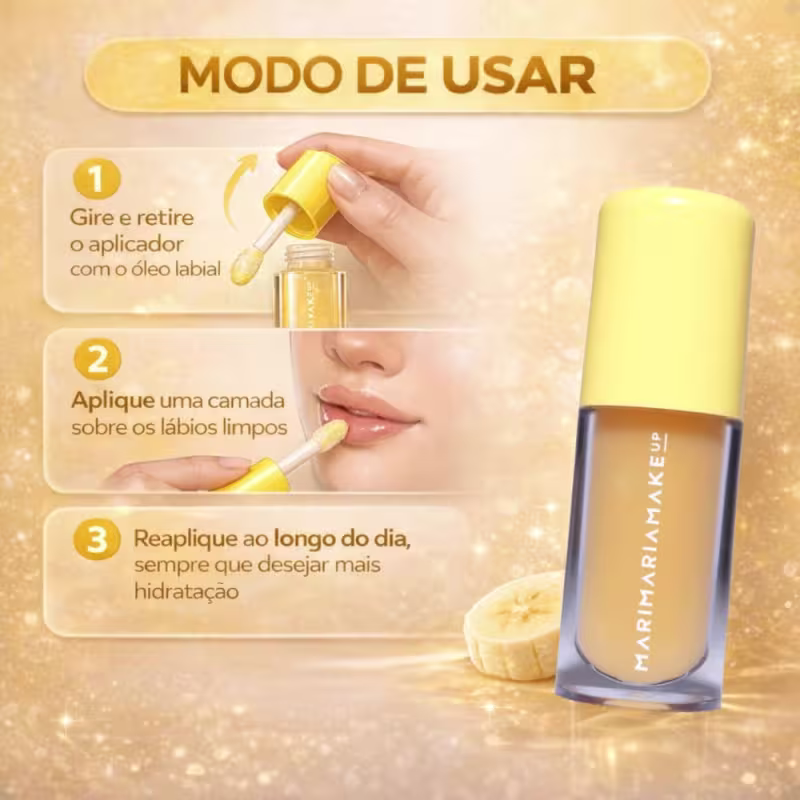 Aplique o Lip Oil Mari Maria Makeup Lip Juice Banana diretamente sobre os lábios limpos e secos, utilizando o aplicador macio e preciso.