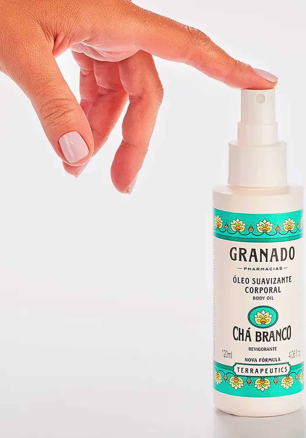 Complementando o cuidado, o Óleo Corporal Chá Branco Granado é formulado com óleos vegetais e vitamina E, que auxiliam na nutrição da pele e ajudam a prevenir o ressecamento. Ele contribui para melhorar a elasticidade, deixando a pele mais suave, luminosa e com toque sedoso. A embalagem com válvula spray facilita a aplicação, tornando o uso prático tanto após o banho quanto em massagens corporais.