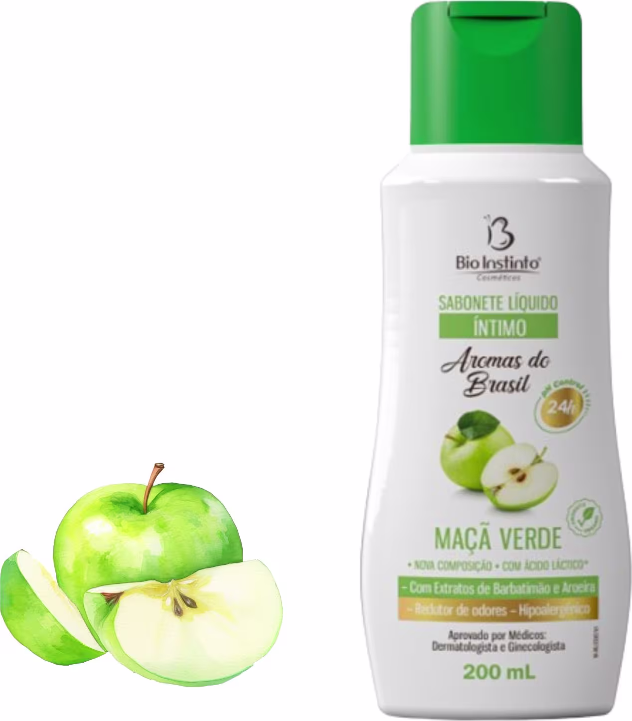 O Aromas do Brasil Sabonete Líquido Íntimo Maçã Verde Bio Instinto possui sistema pH Control, que mantém o pH íntimo equilibrado por 24 horas.