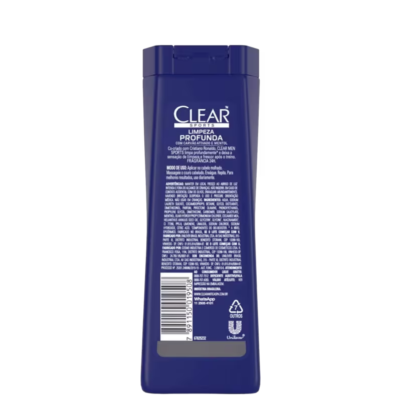 " Desenvolvido para homens que praticam esportes. Porque o couro cabeludo do homem está mais propenso a caspa. " Criado em parceria com Cristiano Ronaldo, Clear Men Sports limpa profundamente ^ e deixa a sensação de limpeza e frescor após o treino. " Com carvão ativado e mentol. Limpa profundamente ^, removendo os resíduos de sujeira e oleosidade. " Carvão ativado é conhecido por absorver o excesso de oleosidade. " Purifica o couro cabeludo e o cabelo danificado pela sujeira, suor e oleosidade após o treino. Além de acabar de vez com a caspa *. *livre de escamas visíveis com o uso regular. " Recomendado para todos os tipos de cabelo. Uso diário. Fragrância 24h. Durante as atividades físicas, elementos como a sujeira, suor e os resíduos podem danificar o couro cabeludo e causar caspa. Criado em parceria com Cristiano Ronaldo, o Shampoo Anticaspa CLEAR Sports Men Limpeza Profunda com Carvão Ativado e Mentol limpa profundamente ^, elimina a oleosidade e purifica couro cabeludo e cabelos. Agora você tem uma preocupação a menos quando o foco é atingir máxima performance nos esportes. Seu cheiro revigorante também mantém seu cabelo cheirando fresco e limpo após o treino. CLEAR Sports apoia a próxima geração de futebol feminino no Brasil. Como usar: 1. Coloque um pouco de shampoo Clear Sports Limpeza Profunda na sua mão (algo do tamanho de uma moeda de 1 real) e aplique sobre o seu cabelo úmido 2. Massageie bem seu couro cabeludo para uma melhor ação 3. Enxágue completamente 4. Para melhores resultados, repita esse processo e use diariamente. Se o shampoo Clear Sports Men Limpeza Profunda atingiu o resultado que você esperava , não guarde para você! Mande sua opinião para nós. Advertências: manter em local fresco ao abrigo de luz intensa e fora do alcance de crianças. Não ingerir. Em caso de contato acidental com os olhos, enxaguar abundantemente. Havendo irritação suspenda o uso e procure orientação médica. Não usar em crianças. *livre de escamas visíveis com o uso regular. ^a anivel epidérmico.