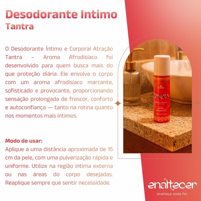 O Desodorante Íntimo e Corporal Atração Tantra – Aroma Afrodisíaco foi desenvolvido para quem busca mais do que proteção diária. Ele envolve o corpo com um aroma afrodisíaco marcante, sofisticado e provocante, proporcionando sensação prolongada de frescor, conforto e autoconfiança — tanto na rotina quanto nos momentos mais íntimos.
