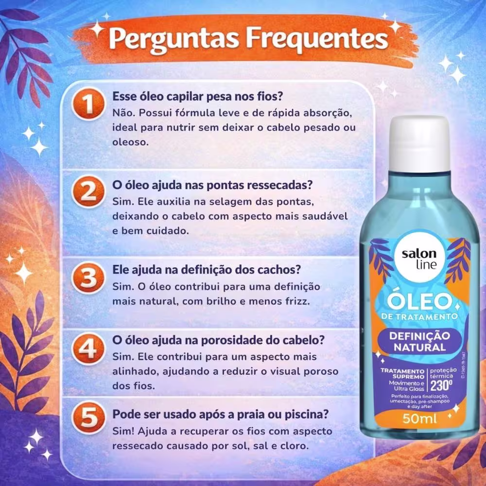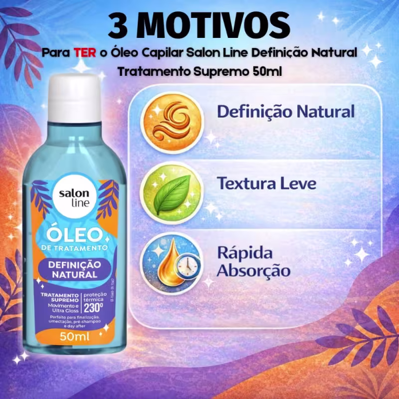 Óleo Capilar Salon Line Definição Natural Tratamento Supremo 50ml O Óleo Capilar Salon Line Definição Natural Tratamento Supremo é o aliado ideal para quem busca cabelos nutridos, definidos e com brilho intenso. Com fórmula leve e altamente nutritiva, ele ajuda a reduzir o frizz, selar as pontas e proporcionar maciez sem pesar nos fios. Perfeito para todos os tipos de cabelo, especialmente cacheados e crespos, esse óleo entrega tratamento e finalização em um único produto, deixando os fios mais saudáveis, alinhados e com aspecto natural.