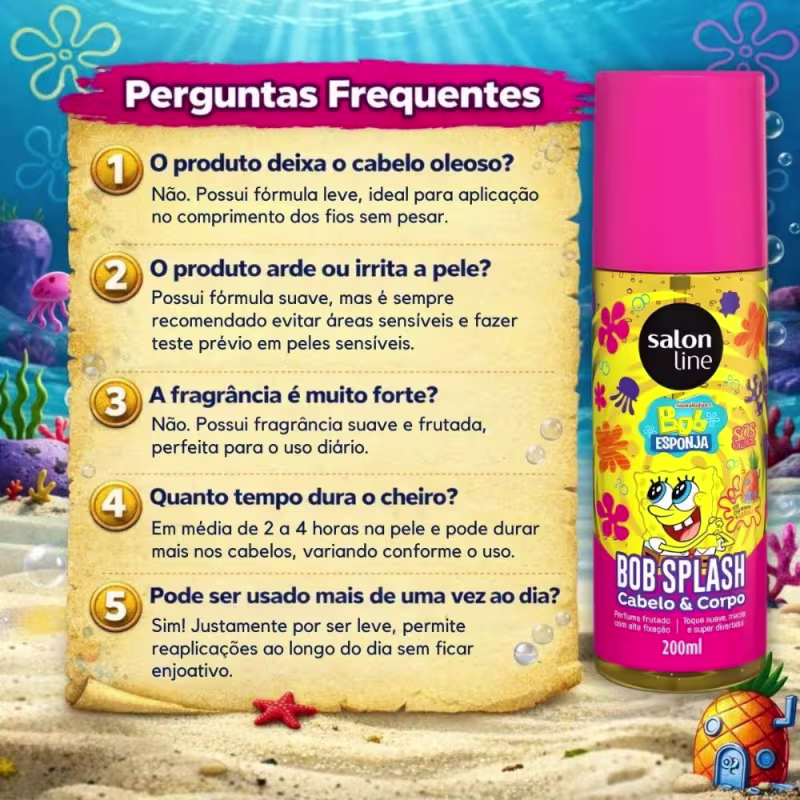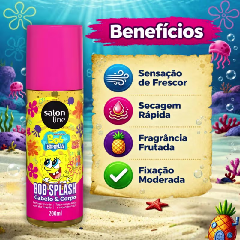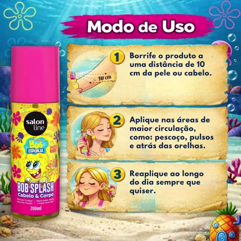 Aplique o Body Splash Cabelo e Corpo Salon Line Bob Esponja Sos Cachos 200ml diretamente sobre os cabelos e/ou corpo, a uma distância adequada, para uma distribuição uniforme. Reaplique sempre que desejar para manter a sensação de frescor e a fragrância agradável. Para melhores resultados, utilize após o banho, com a pele e os cabelos limpos.