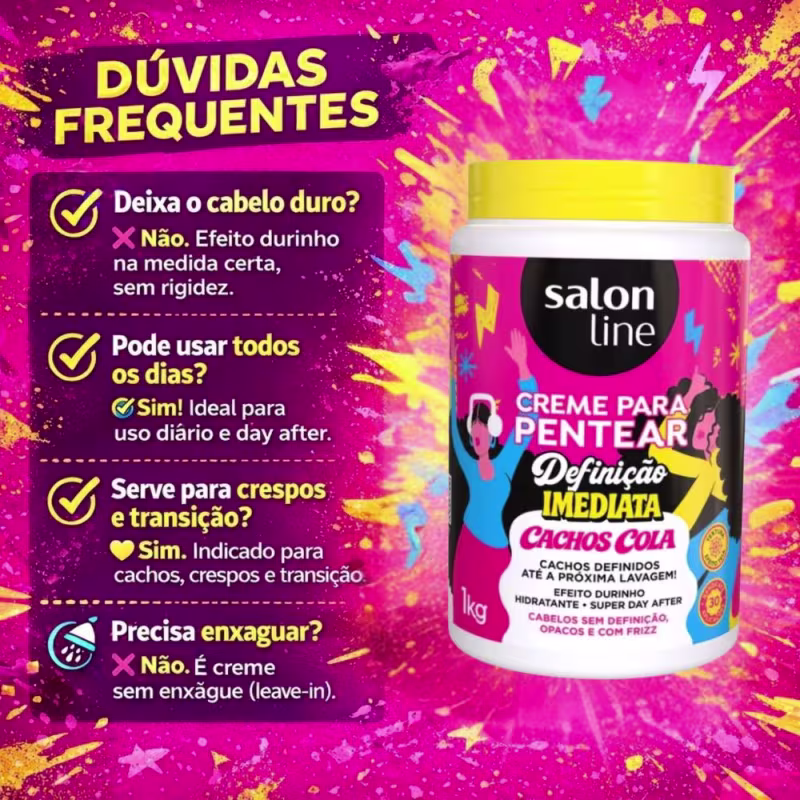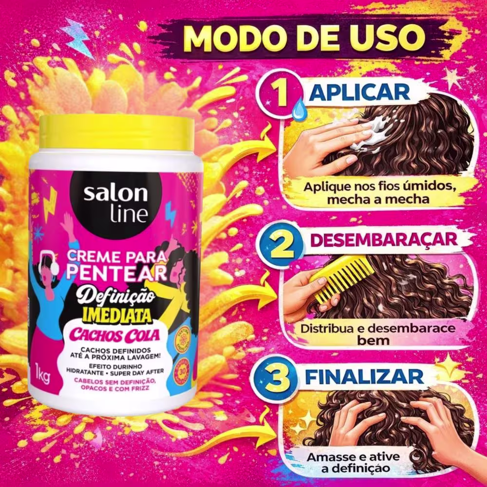 O Creme Para Pentear Salon Line Definição Imediata Cachos Cola 1kg é perfeito para o uso diário, seja para ir ao trabalho, à escola ou para um evento especial. Ideal para quem busca cachos definidos e com volume controlado em qualquer ocasião, adaptando-se a diversas rotinas e estilos de vida. Use-o para um look casual no dia a dia ou para um penteado mais elaborado em festas e eventos.