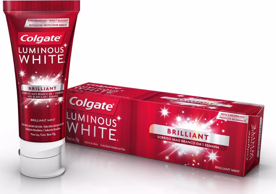Colgate Luminous White Brilliant é um creme para clareamento dental que contém uma poderosa tecnologia de clareamento para um sorriso mais branco em 1 semana