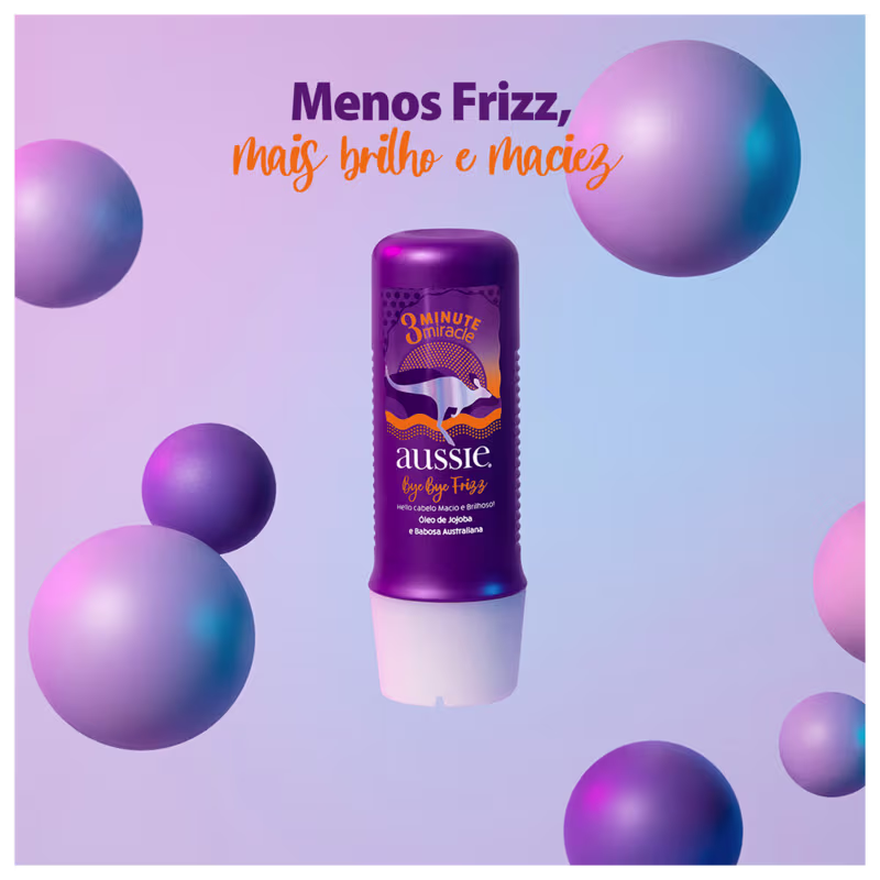 3. Aplique o 3 Minutos Milagrosos Aussie Bye Bye Frizz, deixe agir por 3 minutos e enxágue. 4. Aplique o Condicionador Aussie Bye Bye Frizz para selar as cutículas e enxágue.