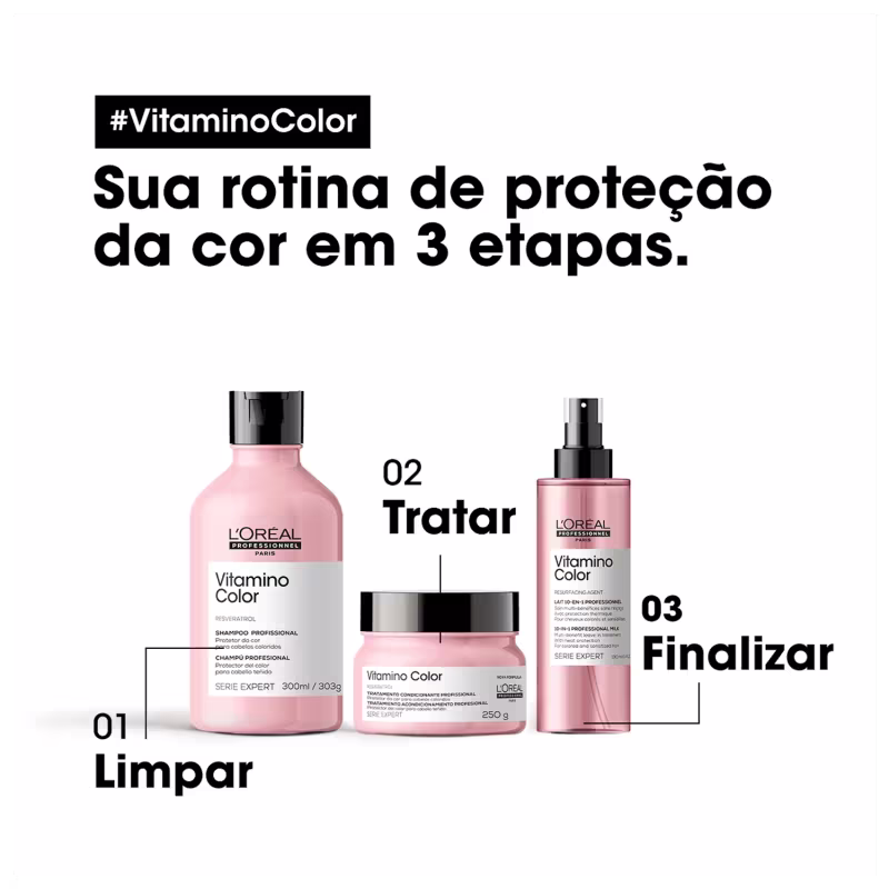 Kit L'Oréal Professionnel Serie Expert Vitamino Color promove a proteção até das cores mais sensíveis, hidratação e luminosidade para os fios. Além disso, seu principal ingrediente possui um poderoso antioxidante presente na casca e nas sementes das uvas, que tem a função de preservar a cor dos cabelos.