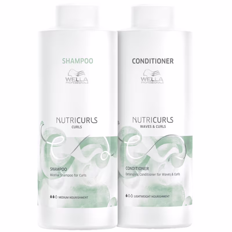 Kit com shampoo e condicionador tamanho profissional para cabelos cacheados ondulados. Kit Wella Professionals Nutricurls Salon Duo é ideal para definir os fios.