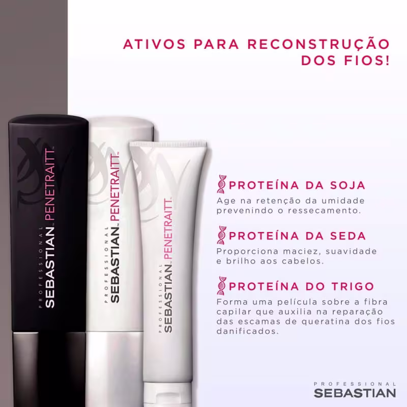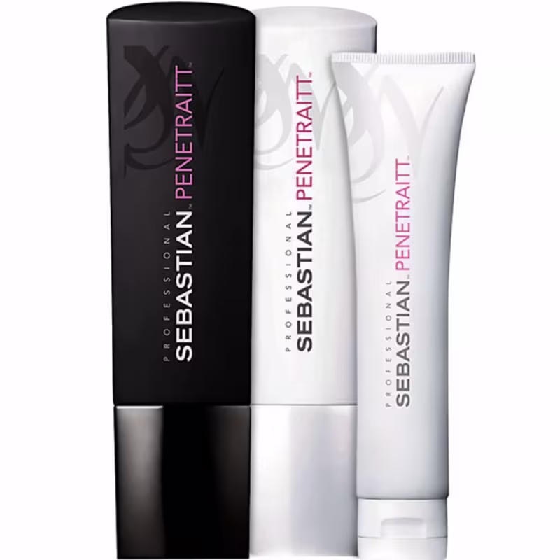 Não sei o CEPKit Sebastian Professional Penetraitt com shampoo, condicionador e máscara de tratamento para cabelos danificados. Trata e recupera os fios.