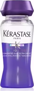 Ampola Kerastase Fusio Dose [HA] Ultra-violet destina-se a revelar um louro luminoso mais frio, um louro mais brilhante e neutralizar instantaneamente os tons fortes e amarelos como a principal preocupação. É um tratamento para todos os tipos de cabelo loiro, onde ele restaura a fibra sensibilizada pós-clareamento ou clareamento, repõe os danos da superfície para um toque mais suave e forte oferecendo ação anti-latão imediata. Pode ser usado como toner após o clareamento ou como ferramenta para manter a cor loira fresca e radiante. Deve ser combinado com o Booster para atender às necessidades secundárias do cabelo.