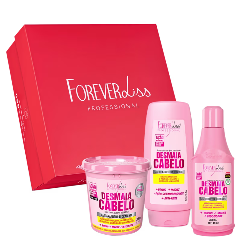 Contém01 – Shampoo Desmaia Cabelo 300ml.01 – Máscara Desmaia Cabelo 350g.01 – Condicionador Desmaia Cabelo 300g.01 - Caixa de Presente Forever Liss - 10cm x 23cm x 23cmObs: Os produtos são enviados fora da caixa.