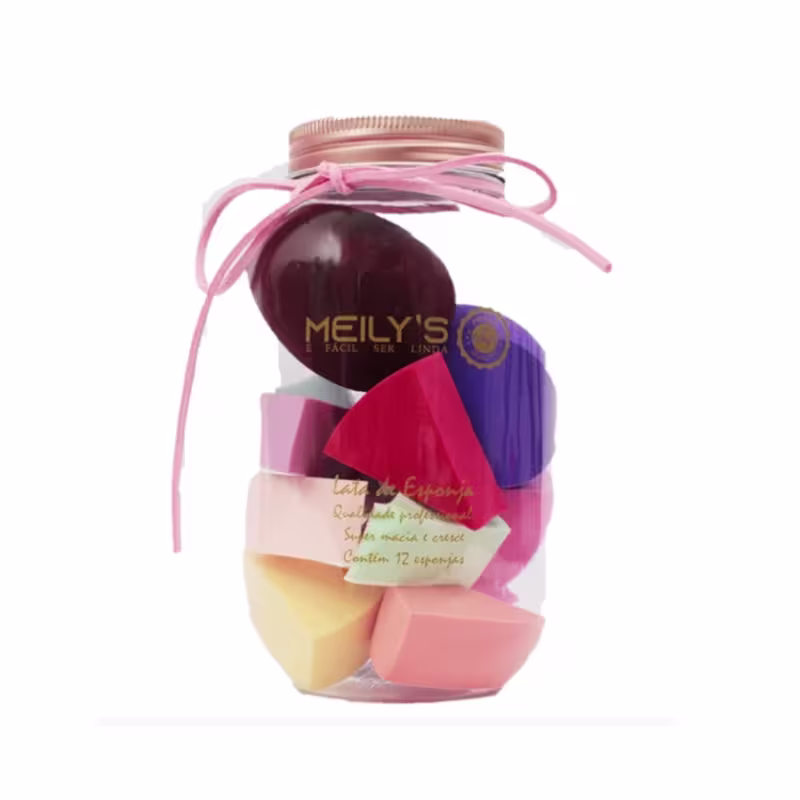 Kit com esponjas para maquiagem.12 Esponjas no Pote Meily´s facilita a aplicação de produtos com diferentes texturas, graças ao seu design moderno e multifuncional.