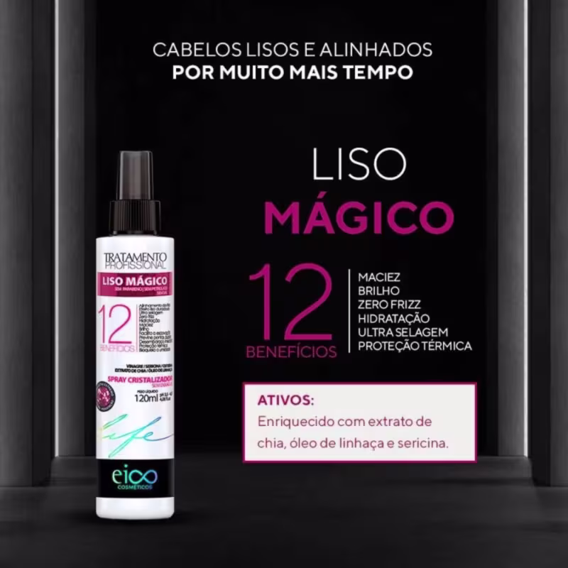 O Spray Eico Life Liso Mágico foi desenvolvido para manter o efeito liso por muito mais tempo,