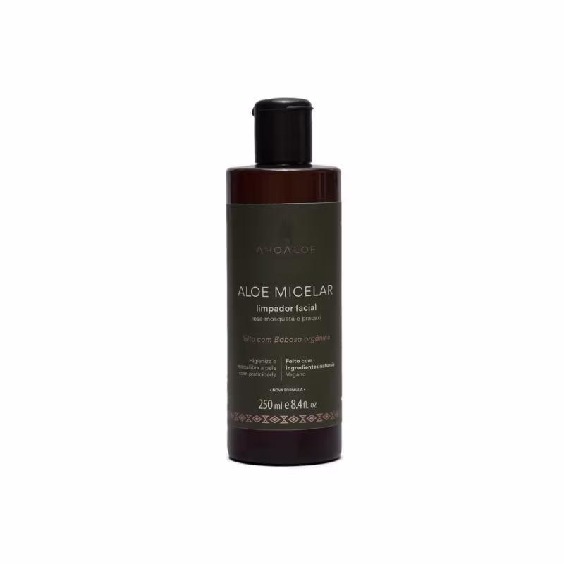 A Água Micelar Demaquilante AhoAloe 250ml combina a ação purificante da babosa com os óleos de rosa mosqueta e pracaxi para remover impurezas e maquiagem sem irritar. Limpa profundamente, hidrata e equilibra a pele, deixando-a renovada e saudável. Com fórmula 100% natural e vegana, não precisa de enxágue e é ideal para todos os tipos de pele. Uma solução prática e eficaz para uma rotina de cuidados consciente.
