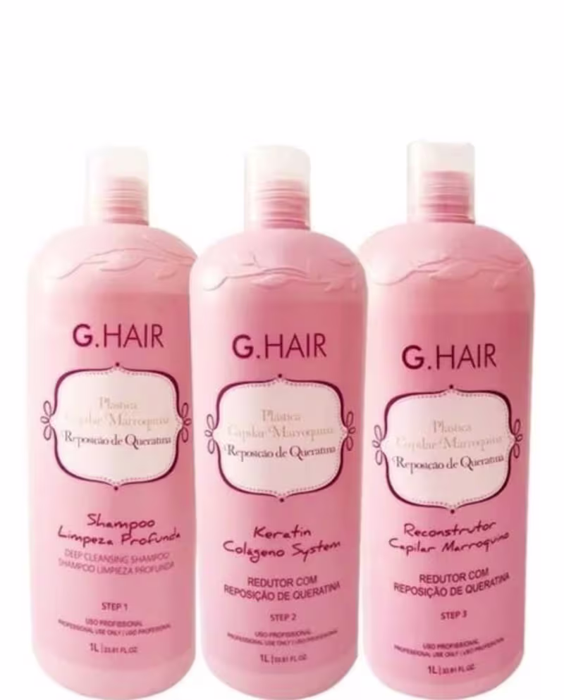 G. Hair Plástica Capilar Marroquina é um tratamento de 3 passos rico em extrato de cacau que é um regenerador e revitalizador natural e aminoácidos fortalecendo e hidratando os fios.