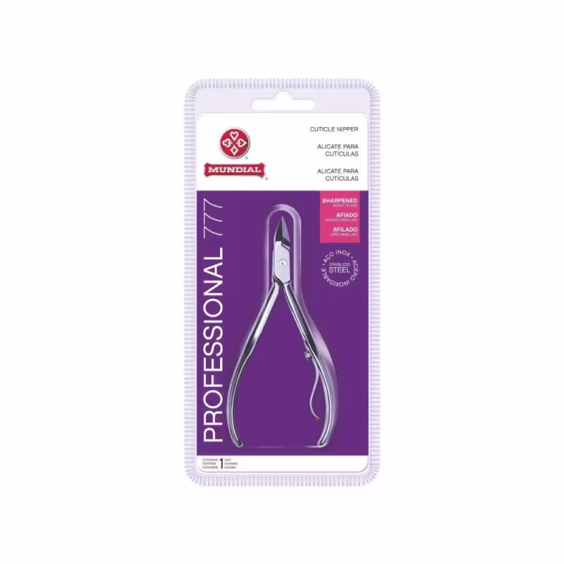 01 Alicate-777: Para utilizar com mais facilidade. Amolecer a cutícula em água quente e ou creme de cutícula, depois tirar a cutícula acompanhando o formato da unha. Para guardar seque o alicate coloque a tampa de proteção que vai no blister.