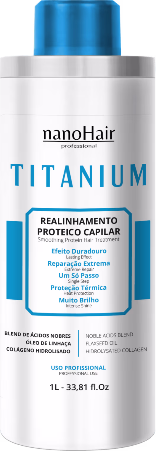Já pensou num produto que realinha com força e ao mesmo tempo é delicado? Já pensou num produto que tem alta durabilidade e mesmo assim não maltrata o cabelo? Parece algo impossível, não é? Pois saiba que você está diante da Titanium - Nano Hair, a escova para alisamento sem formol e em um só passo com a maior carga de tecnologia do mercado. Ela alinha, alisa, retira completamente o frizz, baixa o volume, repara, hidrata e nutre no último degrau do possível. E ainda tem mais, a Titanium dispensa pré-lavagem e pode ser aplicada em apenas 4 etapas simples por qualquer pessoa.