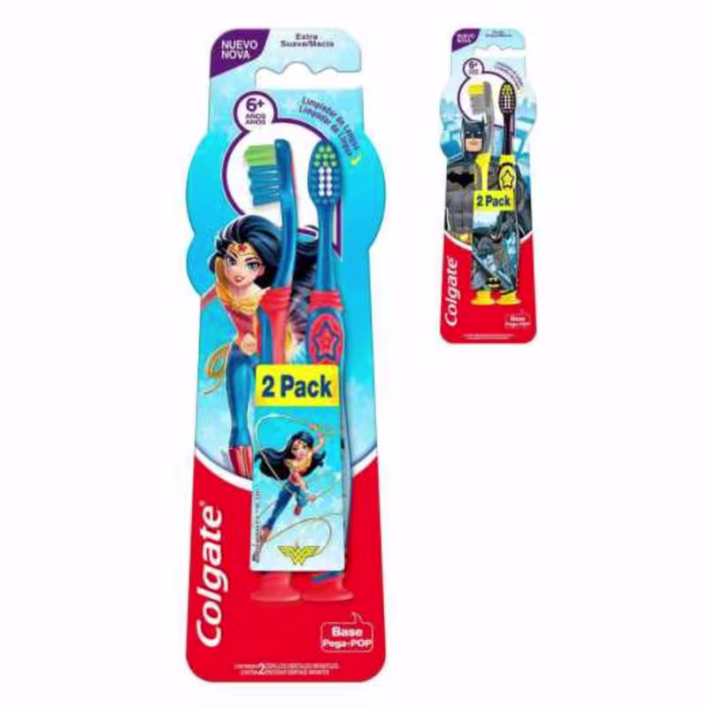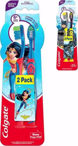 A Escova Dental Infantil Colgate Smiles 6+ Mulher Maravilha & Batman possui cabo antiderrapante, cerdas extra suaves, base pega pop para que a escova fique em pé. Possuem cerdas coloridas que indicam a quantidade recomendada de creme dental. Indicado para crianças maiores de 6 anos ou mais.