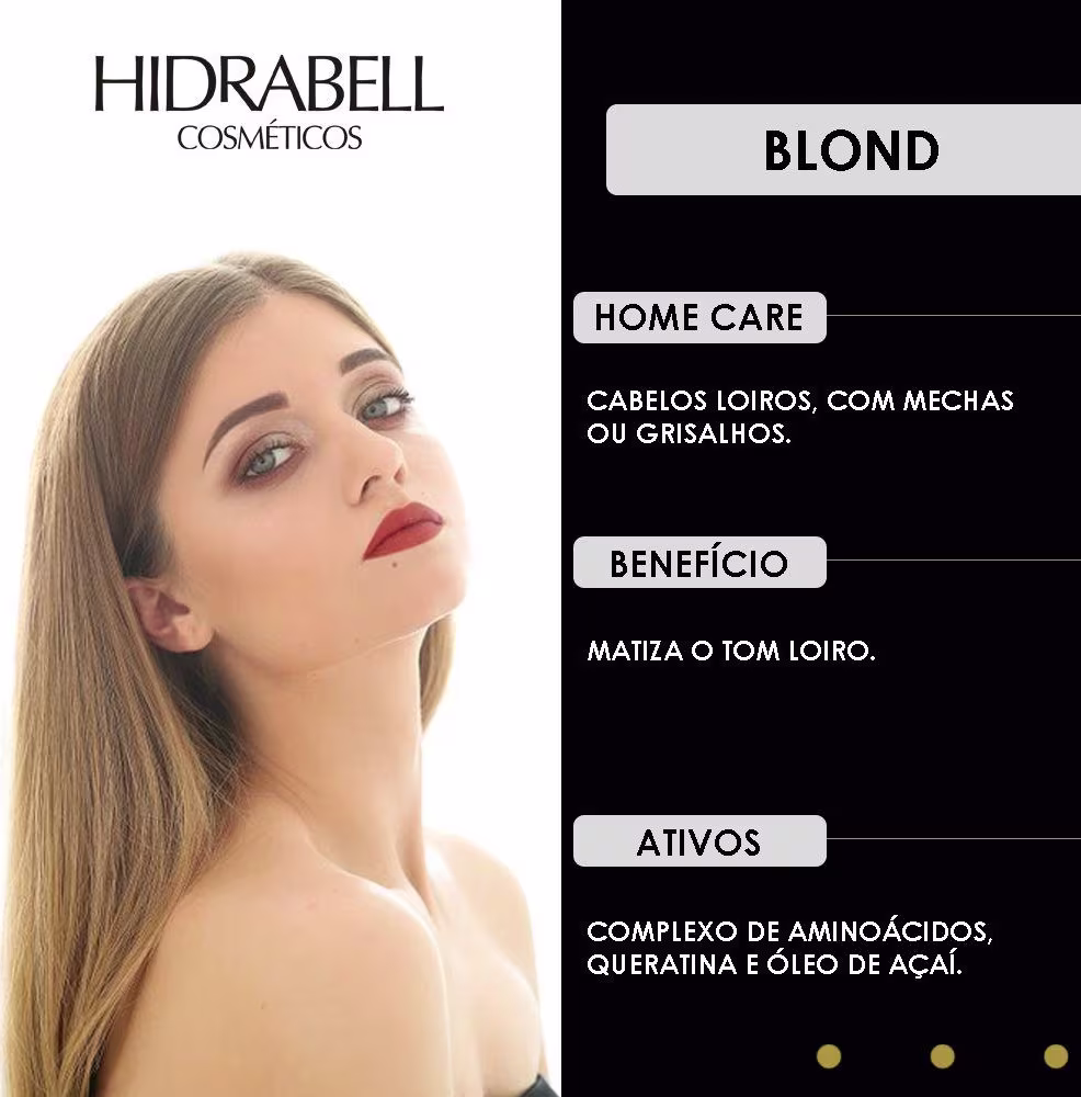 A linha Hidra Color Blond foi especialmente elaborada com excelentes ativos e pigmentos para platinar os cabelos LOIROS (com mechas e grisalhos), tirando o tom amarelado, realçando o brilho, confere um tom vibrante, melhora a flexibilidade, maleabilidade e densidade dos fios. Protegendo e fixando a cor por mais tempo.