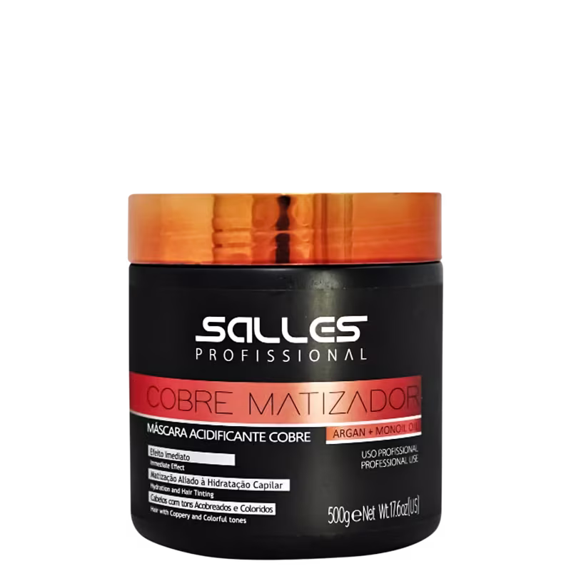 Modo de Usar: Após lavar os cabelos com o Shampoo Salles Profissional, aplicar a Máscara Matizadora Acidificante Cobre Salles Profissional com cabelo úmido deixando 3 a 10 minutos. Não há pausa de tempo determinado. Deixando o tempo necessário, dependendo da altura do tom que está o cabelo ou até atingir a cor desejada. Enxágue abundantemente e finalize como desejar.