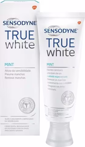 Com Sensodyne True White você tem alívio da sensibilidade e dentes mais brancos. Sua tecnologia remove suavemente as manchas e previne a formação de outras, além de branquear os dentes. Proporciona uma ação branqueadora de forma 10x menos abrasiva que os outros cremes dentais concorrentes. Indicado para pessoas com sensibilidade nos dentes, ou seja, que sentem dores ou desconforto ao comer ou beber alimentos gelados, quentes, doces ou cítricos, além de possuir todos os benefícios de um creme dental regular.
