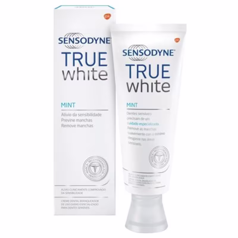 Sensodyne True White proporciona alívio clinicamente comprovado da sensibilidade e proporciona um sorriso mais branco. A nova fórmula remove suavemente as manchas e previne a formação de outras, além de branquear os dentes.