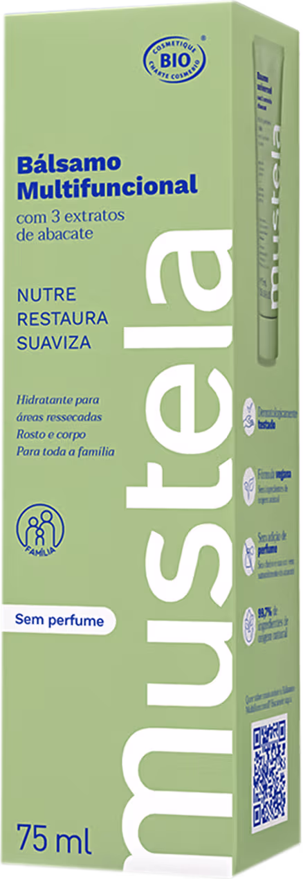 Bálsamo hidratante multifuncional corporal. Mustela nutre, restaura e suaviza as áreas ressecadas da pele, garantindo renovação, maciez e luminosidade.
