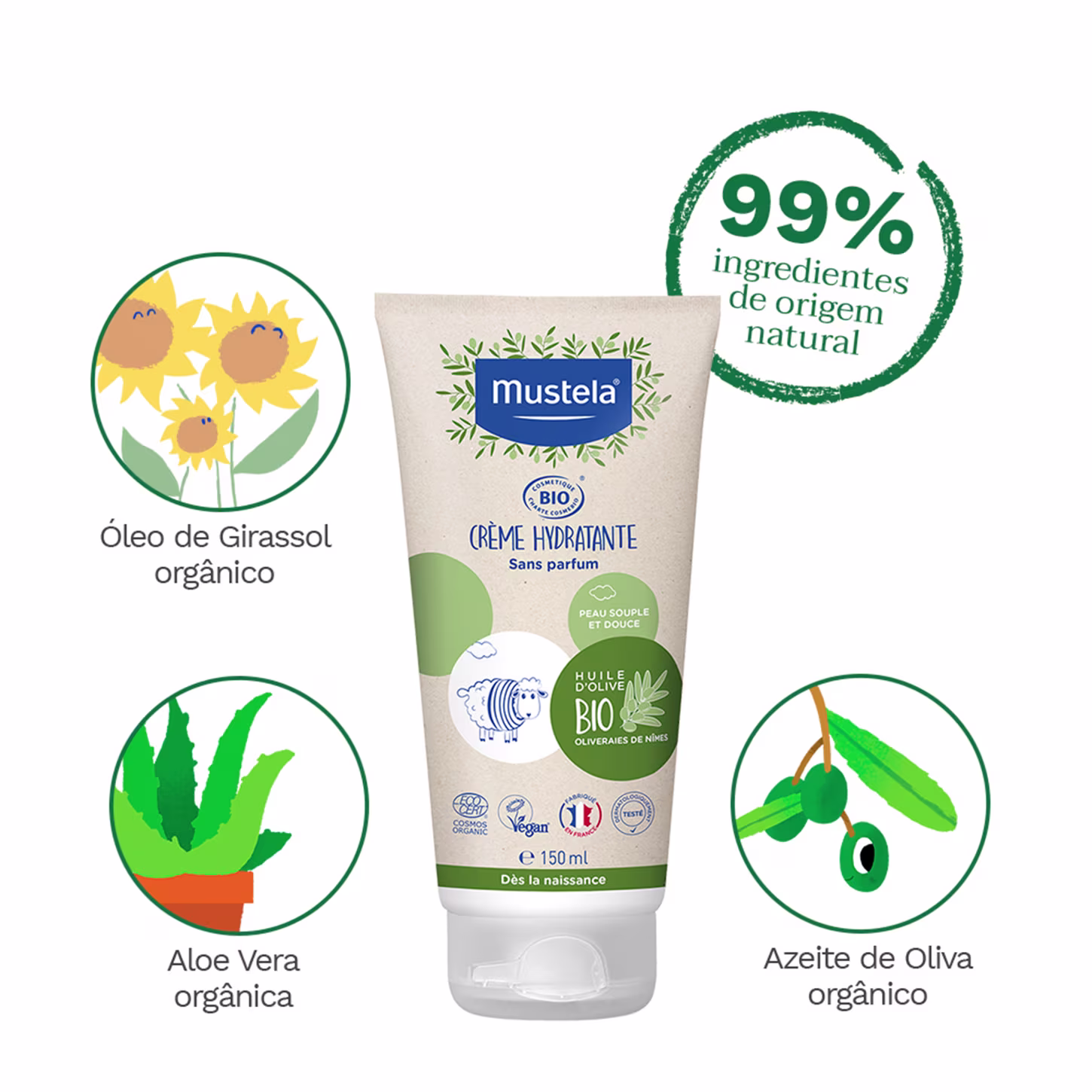 Creme Hidratante Corporal Mustela BIO é sem perfume e conta com Aloe Vera, Azeite de Oliva e Óleo de Girassol orgânicos. Foi formulado para hidratar as peles mais frágeis e delicadas, desde o nascimento, deixando a pele macia e hidrata de forma duradoura. Para respeitar o meio ambiente e as pessoas e minimizar o seu impacto, creme possui fórmula vegana e sua embalagem é feita a partir da cana-de-açúcar.
