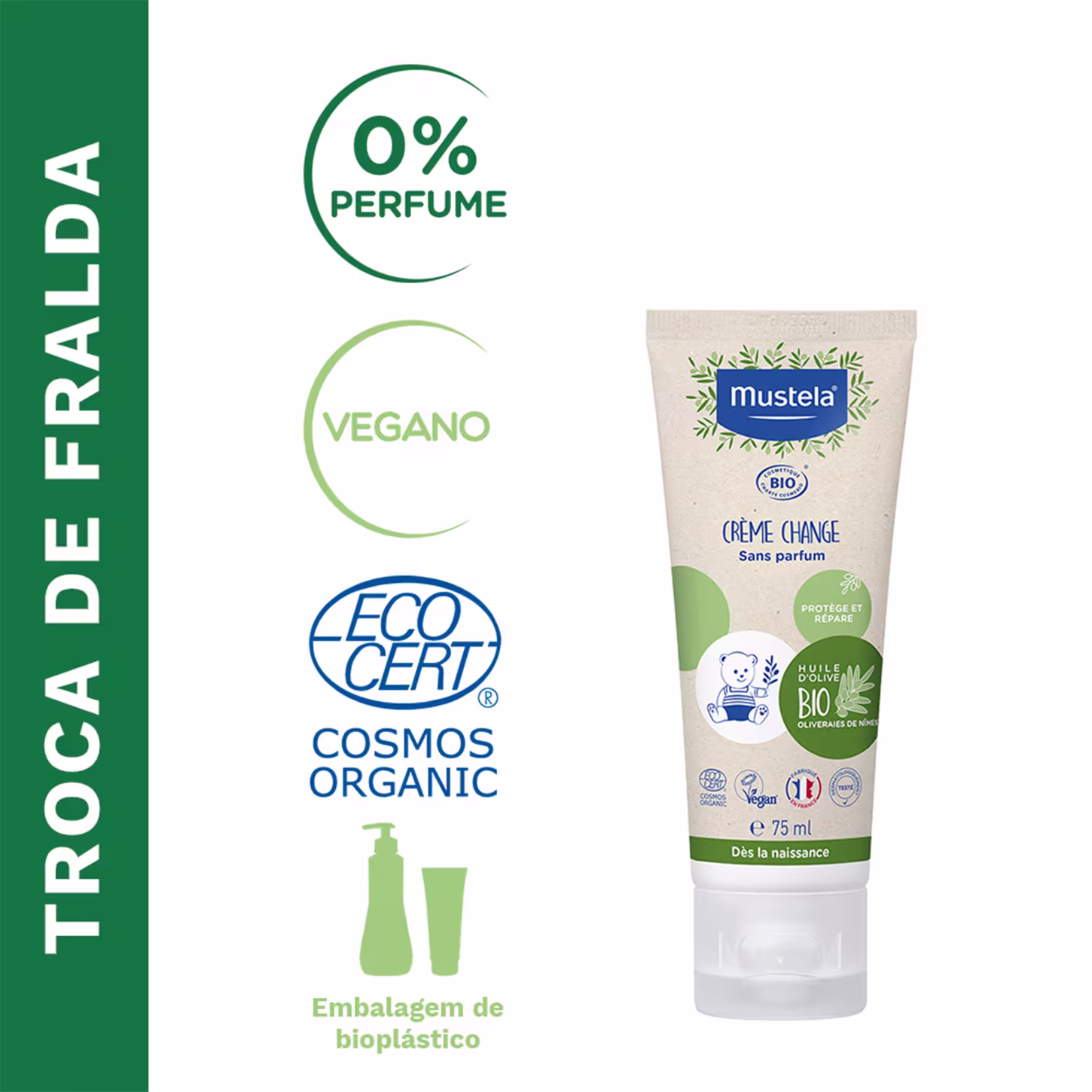 Creme para Assaduras Mustela BIO Creme Preventivo conta com 50% de ingredientes provenientes de agricultura orgânica, como a Aloe Vera e o Azeite de Oliva. Sua fórmula forma uma película protetora, aliviando a vermelhidão e protegendo a pele do bebê. Para respeitar o meio ambiente, o produto possui fórmula vegana e sua embalagem é feita a partir da cana-de-açúcar.