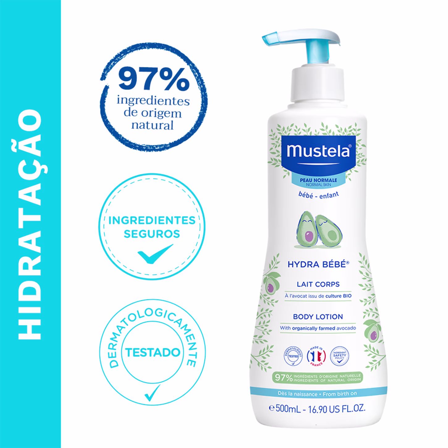 A Loção Hidratante Corporal Mustela Hydra Bébé foi especialmente pensada para cuidar da pele dos pequenos desde o nascimento. Com 97% de ingredientes de origem natural, o produto - que conta com Abacate Orgânico na composição - também oferece textura agradável, garante rápida absorção e confere sensação instantânea de conforto.