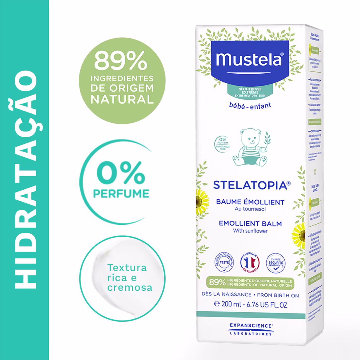 Conta com ingredientes de origem natural, entre eles: Óleo Destilado de Girassol, Perseose de Abacate e Cera de Carnaúba. É hipoalergênico e dermatologicamente testado. Não contém parabenos, ftalatos, phenoxyethanol, fragrância e corantes. Seguro para uso desde o nascimento.