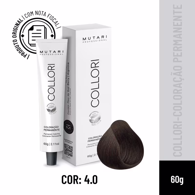 A Coloração Permanente Mutari Collori foi desenvolvida com Óleo de Goji Berry e Arginina, que evita o ressecamento e confere hidratação intensa dos fios, ao mesmo tempo que fornece uma pigmentação ideal e uniforme. Sua fórmula é 100% vegana, e garante segurança completa, sem agredir os fios. Proporciona uma deliciosa ação de bem estar e vitalidade aos cabelos, com resultados surpreendentes.
