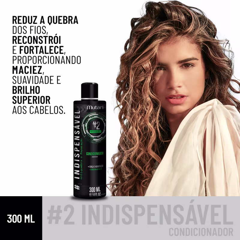 O Condicionador Mutari Indispensável #2 proporciona hidratação, regeneração e reestruturação da fibra capilar, devolvendo força, brilho, elasticidade e maciez ao cabelo. Sua poderosa fórmula com Proteína da Quinoa, Lumini TM system, Genencare OSMS ® e Óleo de coco traz ação antiquebra e efeito imediato, garantindo um resultado deslumbrante.