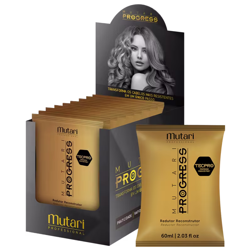 Escova progressiva em sachê de apenas um passo de Grau 2. Mutari Progress alisa os fios com segurança, sem agredir.