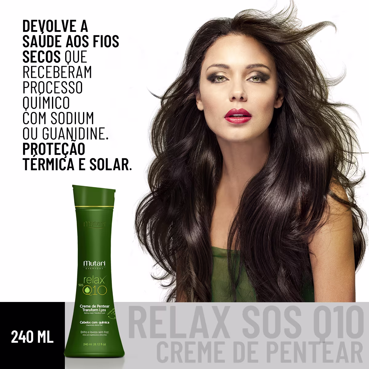 Creme de pentear para cabelos quimicamente tratados. Mutari Relax SOS Q10 Transform Lyss devolve a saúde aos fios quebradiços e emborrachados.