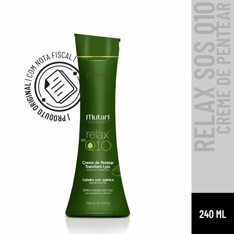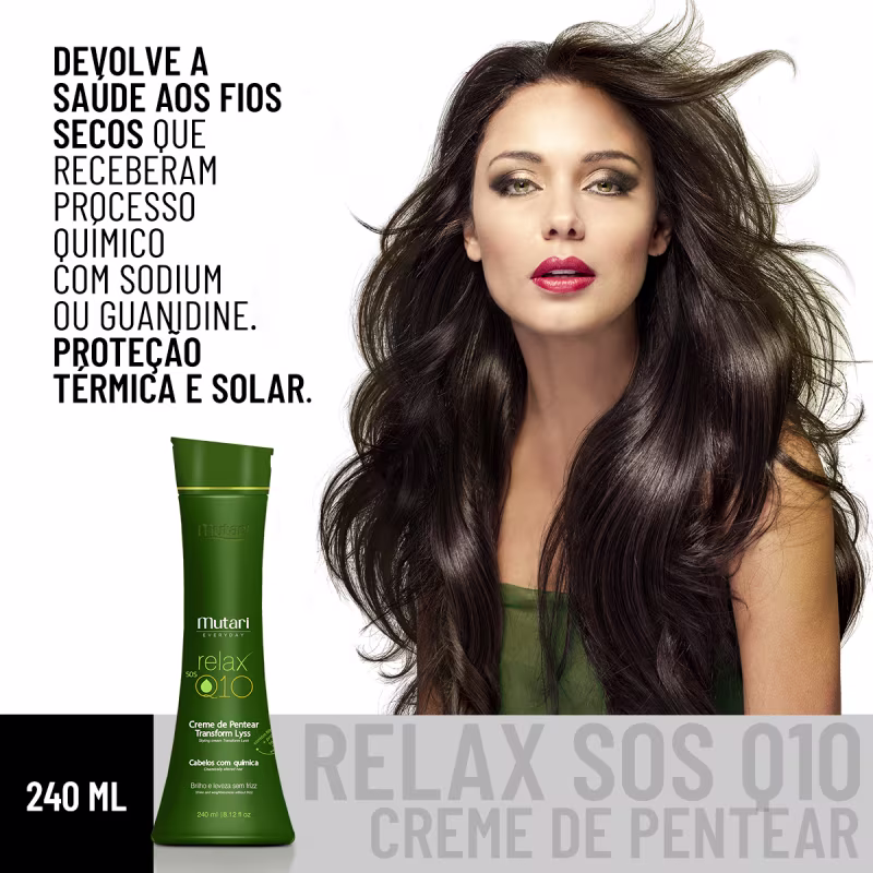 O Creme de Pentear Mutari Relax SOS Q10 Transform Lyss, enriquecido com AmazonTrat®, fornece toque de seda sobre os fios, proporcionando excelente brilho e maciez. Sua fórmula possui propriedades reconstrutoras da fibra capilar, devolvendo força e saúde aos cabelos. Com filtro solar e proteção térmica, sendo ideal para cabelos que passaram por processos químicos como relaxamento, alisamento, progressivas e descoloração. Garante resultados inacreditáveis, com ação antioxidante e brilho 3D.