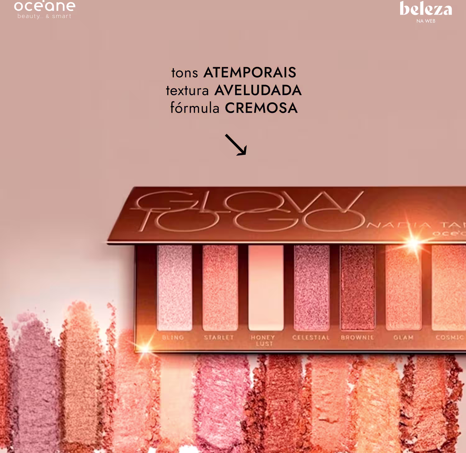 Paleta de sombras com 8 cores. Nádia Tambasco By Océane Glow to Go traz tons atemporais, que se adaptam em uma make incrível para todos os tons de pele e para qualquer ocasião. Idealizada em parceria com maquiadora e embaixadora da marca, que propõe um olhar elegante, destacado, para looks dia e noite.